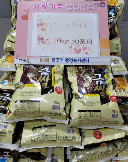 익명의 독지가는 월곶면에 쌀 10kg 50포대(145만 원 상당)를 기탁했다. 독지가는 한가위에도 미소짓기 어려운 이웃들이 조금이라도 마음의 짐을 덜 수 있길 희망한다며 나눔을 실천했다.