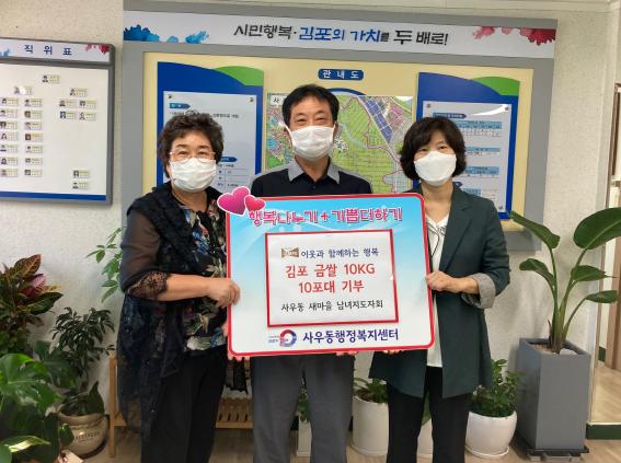사우동새마을남녀지도자회는 지난 15일 사우동행정복지센터에 추석명절을 맞이하여 어려운 이웃을 돕고자 김포금쌀 10포대를 기탁했다.