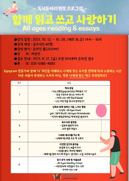 김포시 중봉도서관은 독서동아리 활성화를 위해 오는 10월 12일부터 10월 29일까지 매주 화요일과 금요일 14시부터 16시까지 총 6회에 걸쳐 「함께 읽고 쓰고 사랑하기」 강좌를 Zoom(줌)으로 운영한다.