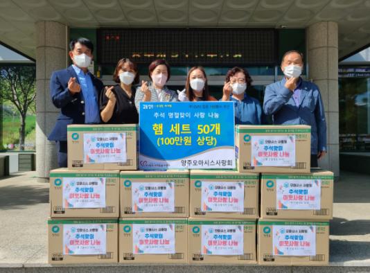 이날 양주오아시스사랑회(회장 정화익)는 햄세트 등 100여만원 상당의 물품을 센터에 기탁했으며 후원품은 회천노인복지기관, 양주시장애인복지관, 옥정복지관, 저소득 장애인 등 취약계층에 전달할 예정이다.