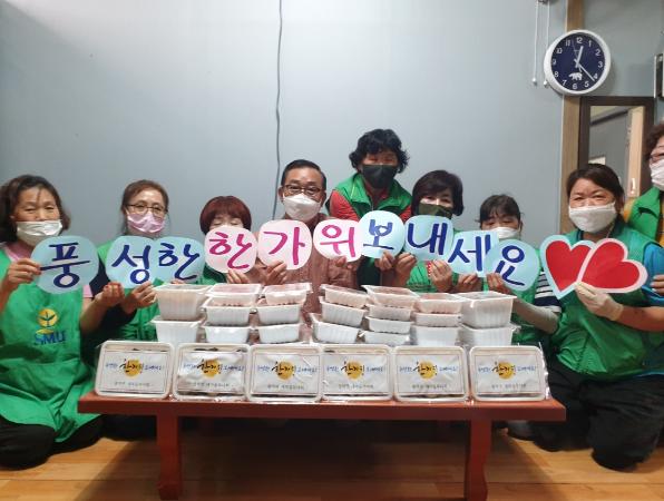 이날 행사에는 부녀회원들이 추석 대표 음식인 송편과 동태전, 동그랑땡, 버섯전 등을 정성스레 조리하여 개별포장 후 독거노인 등 지역사회 소외계층 17가구에 방역수칙을 준수해 직접 전달하며 안부를 확인했다.