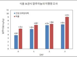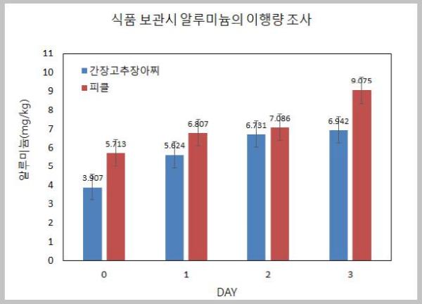 아울러 염도와 산도가 높은 음식을 알루미늄 용기에 보관할 때 조리기구로부터 식품으로 알루미늄 이행량도 조사했다. 간장고추장아찌와 피클을 알루미늄 일회용 용기에 3일간 보관 시 알루미늄의 식품으로 이행량은 간장고추장아찌는 보관개시일 3.9 mg/kg에서 3일째 6.9 mg/kg로 180% 증가했고, 피클은 보관개시일 5.7 mg/kg에서 3일째 9.1 mg/kg로 160% 증가했다. 다만 국내 및 국제식품규격위원회(CODEX)에서 정하고 있는 알루미늄 함유 식품첨가물의 사용기준을 참고했을 때 이행된 양은 안전한 수준이었다.