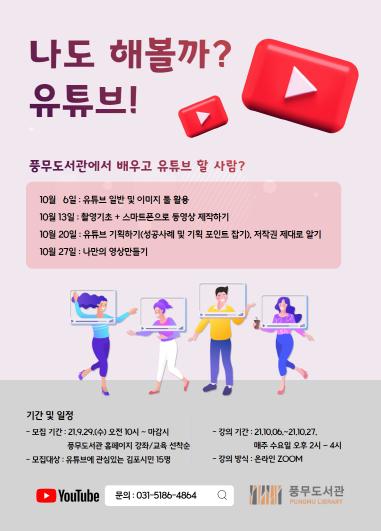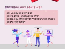 김포시 풍무도서관은 10월 6일부터 27일까지 매주 수요일 오후 2시부터 4시까지 특화프로그램 「나도 해볼까? 유튜브!」 강좌를 운영한다.