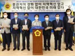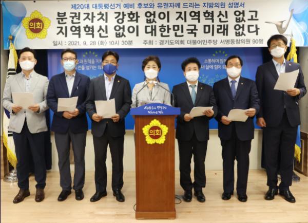 경기도의회 더불어민주당 도의원 90명이 2021년 9월 28일 10:30 경기도의회 브리핑룸에서 “분권자치 강화 없이 지역혁신 없고, 지역혁신 없이 대한민국의 미래 없다”는 내용으로 20대 대통령선거 예비 후보와 유권자께 드리는 지방의원 성명서를 발표했다.