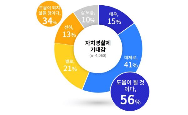 자치경찰제에 대해서는 41%가 ‘치안서비스 향상에 대체로 도움이 된다’고 대답하는 등 높은 기대감이 확인됐다. 다만 58%가 ‘들어본 적 있으나 내용까지는 잘 모른다’고 응답, 적극적인 홍보가 필요한 것으로 조사됐다.