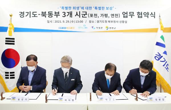 이재명 경기도지사와 박윤국 포천시장, 김성기 가평군수, 김광철 연천군수는 29일 경기도청 북부청사에서 이런 내용을 담은 ‘특별한 희생에 대한 특별한 보상을 위한 업무협약서’에 서명했다.