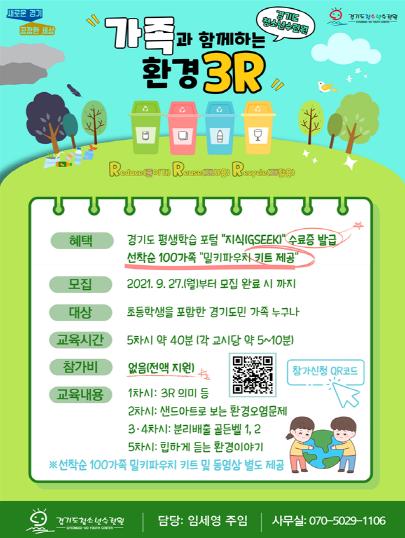 초등학생을 포함한 경기도민 가족은 누구나 참여할 수 있으며 선착순으로 100가족을 모집한다. 참가비와 교육 영상 시청, 업사이클링(Upcycling) 활동 체험 물품비는 무료다.
