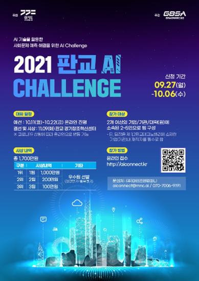 경기도는 10월 6일까지 사회문제 해결을 위한 ‘판교 AI Challenge(인공지능 챌린지)’ 접수를 진행한다고 밝혔다.