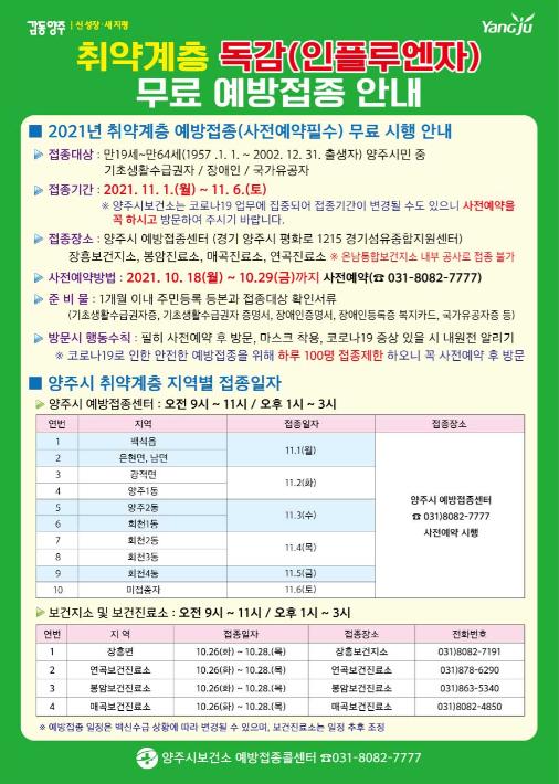 만 19세~64세까지의 양주시민 중 기초생활수급자, 장애인, 국가유공자 등을 대상으로 하는 취약계층 독감 무료 예방접종은 오는 11월 1일부터 6일까지 양주시 예방접종센터, 보건지소, 보건진료소에서 진행된다.