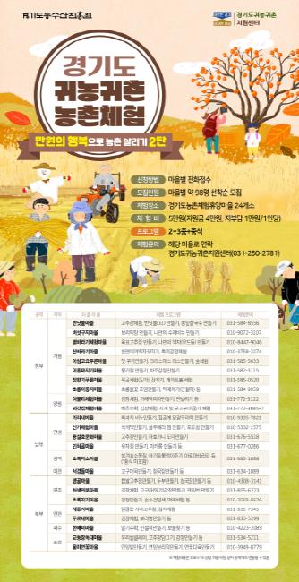 체험은 경기농촌체험휴양마을협의회 소속 체험마을 24곳에서 진행된다. 권역별로 보면 ▲동부권 : 가평군, 양평군 ▲남부권 : 안성시, 평택시, 이천시 ▲북부권 : 양주시, 연천군, 파주시, 포천시 등이다.
