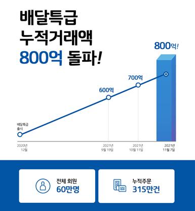 경기도주식회사는 이달 7일 기준 배달특급 총 누적 거래액이 800억 원을 돌파했다고 8일 밝혔다. 회원 60만 명, 누적 거래액 315만 건을 넘어서며 초기의 우려를 불식하고 꾸준한 우상향 성장 그래프를 그리는 중이다.