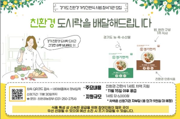 경기도농수산진흥원이 11월 30일까지 ‘경기도 친환경 가정간편식 도시락 차액 지원’ 참여 기관을 모집한다.