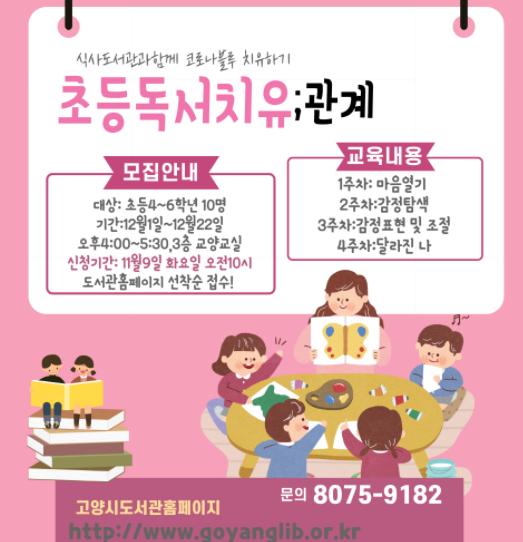 고양시 식사도서관이 오는 12월 1일부터 12월 22일까지 초등학교 4~5학년 학생을 대상으로 독서 치유 프로그램 「초등독서치유 ; 관계」를 운영한다.
