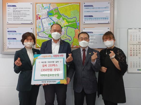 이날 이마트김포한강점에서는 김장김치 233박스 (350만원 상당)를 기탁하였으며, 마산동행정복지센터에서는 명예사회복지공무원으로 활동하는 솔터마을 관리사무소 직원들과 함께 국민임대아파트에 거주하는 독거노인과 한부모가정 등에 전달할 계획이다.