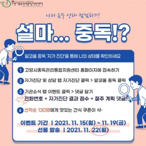 캠페인은 ▲알코올 중독 자가 진단 실시 ▲건강한 절주 계획 작성이 주 내용이며, 11월 15일부터 11월 19일까지 고양시 중독관리통합지원센터 홈페이지에서 참여할 수 있다.