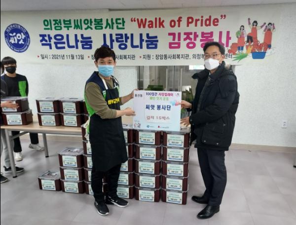 의정부시 흥선동은 씨앗봉사단은 의정부시 100일 사랑릴레이 배턴 잇기 일환으로 직접 담근 김장김치 15상자 (1상자 10kg)를 흥선동 아동 양육 취약계층 15가구에게 전달했다고 11월 15일 밝혔다.