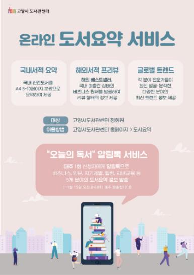 고양시 도서관센터는 책에 대한 요약정보를 온라인으로 제공하여 시민들이 스마트한 독서 생활을 할 수 있도록 온라인 도서요약 서비스를 11월 15일부터 시작했다.