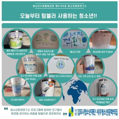 이번 청소년 환경 연구소 프로그램은 ▲친환경 텀블러 만들기, ▲환경보호 캠패인 활동, ▲기상, 환경관련 직업 및 전공 알아보기를 통해 진로탐색 및 친환경의 필요성을 소개하였다.