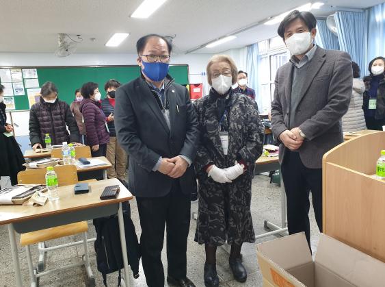 경기도의회 교육행정위원회 유근식 의원(더민주, 광명4)이 지난 13일 매주 실시하는 방역봉사를 마치고 출석수업이 진행중인 광명중 부설 방송통신중학교를 방문하였다. 학교를 둘러보고 쉬는 시간을 활용해 유 의원은 윤병훈 교장선생님과 함께 현재 3학년에 재학중인 올해 88세(34년생)가 되신 만학도 박정완 할머니를 만나 담소를 나누었다.