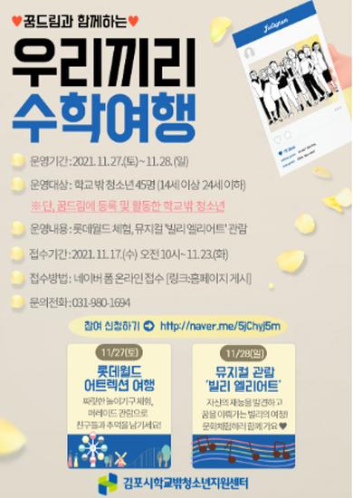 (재)김포시청소년재단 학교밖청소년지원센터는 수학여행의 기회가 없는 학교 밖 청소년들에게 ‘우리끼리 수학여행’을 일일 체험형으로 11월 27일 ~11월 28일까지 2일간 운영한다.