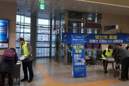 고양시 덕양구 행신2동 주민자치회는 17일 행신역에서 시민을 대상으로 ‘KTX 행신역 발 강릉선 지정’을 위한 거리 서명운동을 진행했다.