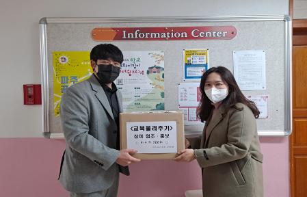 경기도파주교육지원청은 19일, 학생 교복물려주기 참여 활성화를 위하여 파주교복은행(이스마트장터 사회적협동조합)과 함께 관내 중·고등학교에 친환경 마스크를 전달하였다.