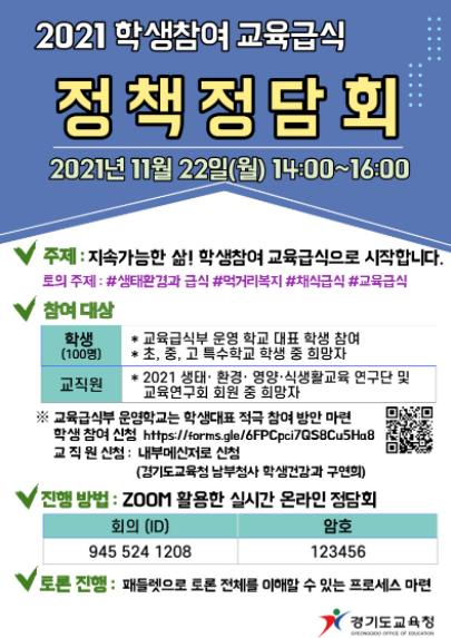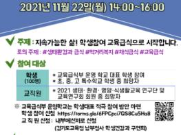 또, 지난 9월 학교급식 참여 활성화를 위해 보급한 「교육급식 길라잡이」 활용 사례와 ‘2021 학생참여 영양・식생활교육 프로젝트 공모전’을 통해 발굴한 실천사례도 함께 나눈다.