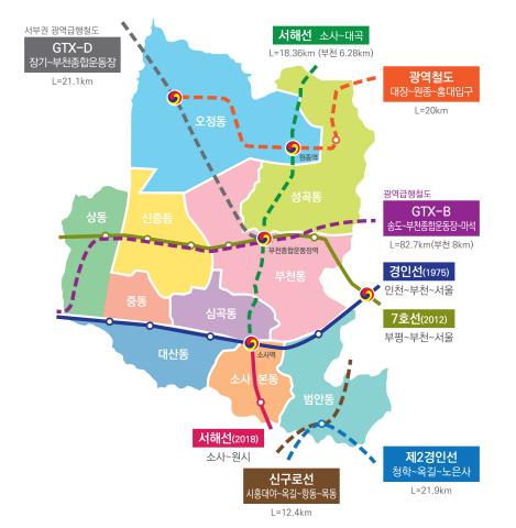 특히, GTX-B노선은 부천종합운동장에서 서울역까지 45분에서 12분으로 이동시간이 대폭 단축돼, 서울과의 접근성을 획기적으로 높이고 교통체증으로 인한 도로 혼잡을 해소할 것으로 기대를 모으고 있다.