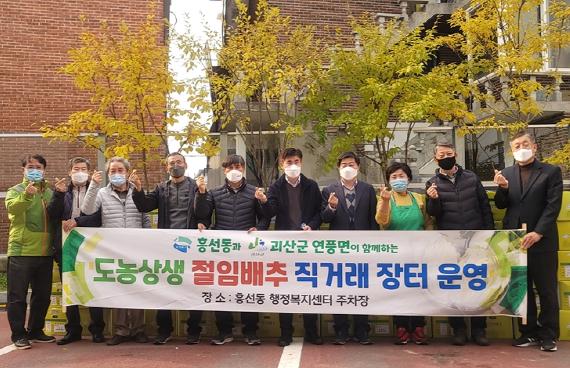 이날 흥선동행정복지센터 직거래장터 운영 시, 충북 괴산군 김현용 연풍면장, 심석진 연풍면 주민자치회 부위원장 및 구전회 분과위원장이 참석한 가운데, 앞으로도 양 지역 간 도농교류 및 문화적 분야의 활발한 교류로 돈독한 동반자 관계를 이어가기로 했다.