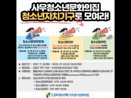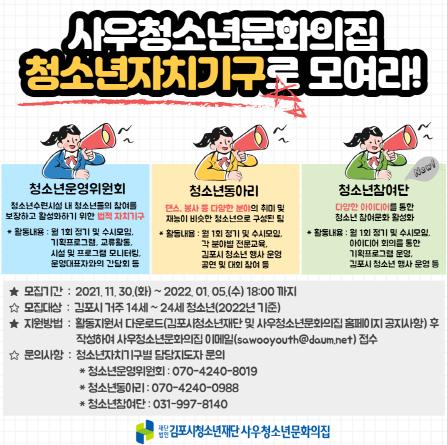 (재)김포시청소년재단 사우청소년문화의집이 2022년 한 해 동안 문화의집을 이끌어나갈 청소년자치기구 및 동아리를 모집한다고 밝혔다.