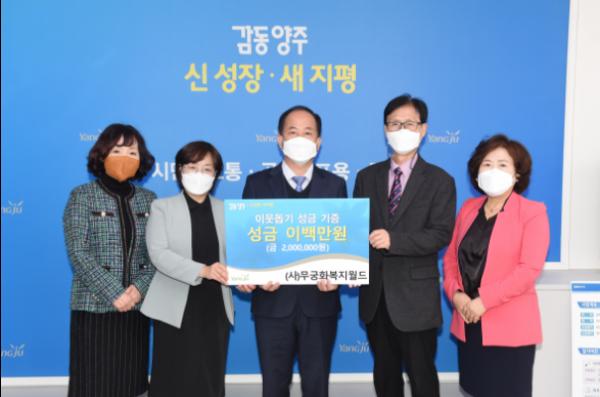 양주시는 지난 22일 (사)무궁화복지월드와 (주)KRC가 양주시청을 방문해 어려운 이웃을 위해 써달라며 이웃돕기 성금을 기부했다고 밝혔다.