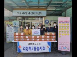 의정부시 의정부2동적십자봉사회는 11월 23일 카스텔라 머핀과 먹물연유 빵이 가득 담긴 빵 꾸러미 20상자를 의정부2동주민센터에 기탁했다.