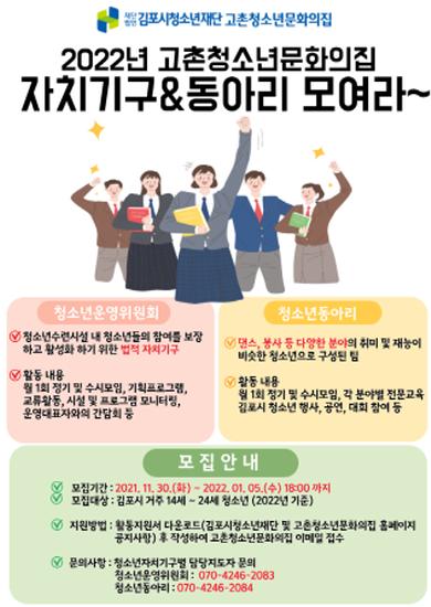 (재)김포시청소년재단 고촌청소년문화의집이 2022년 한 해 동안 문화의집을 이끌어나갈 청소년자치기구 및 동아리를 모집한다고 밝혔다.