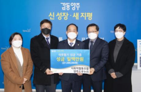 시에 따르면 지난 25일 직장공장 새마을운동 양주시협의회(회장 오수영)에서 백미 10kg 50포, 양주지역 건축사회(감리협회장 강성영, 건축사협회장 김남영)에서 성금 300만원, 사회적협동조합 양주도우누리(이사장 맹두열)에서 성금 100만원을 기탁했다.