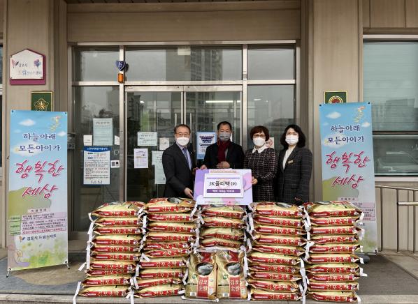 JK폴리백은 지난 25일 여성가족과장 및 김포복지재단 이사장이 참석한 가운데 설 명절을 맞이하여 취약계층 아동을 위해 백미(10kg) 100포를 김포시 드림스타트에 기탁했다.