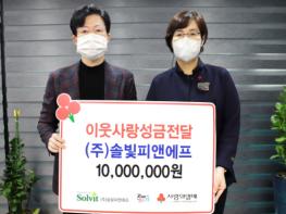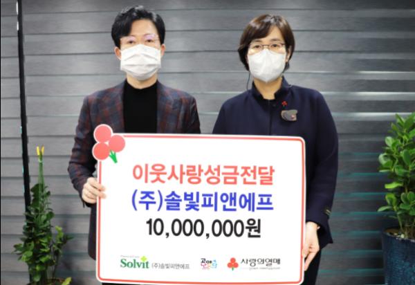 고양시 ㈜솔빛피앤에프(대표 손원록)에서 사랑의 성금 1천만원을 기부했다고 26일 밝혔다.