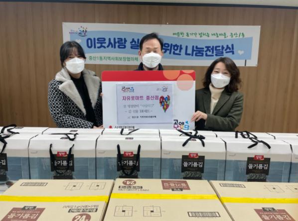고양시 일산동구 중산1동은 지난 25일 ㈜오동 자유로마트(대표 조창현)가 설 명절을 맞이하여 관내 소외된 이웃을 위해 김 100상자(약 100만원 상당)를 기탁했다고 전했다.