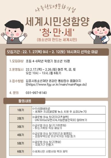 (재)김포시청소년재단 사우청소년문화의집에서는 세계 시민 사회의 주체이자 책임 있는 사회 구성원으로서 청소년이 주체가 되어 전 지구적 문제를 이해하고 민주적 의사 결정 과정을 통해 올바른 해결 방법을 모색해 보는 세계 시민성 함양 프로그램 ‘청 · 만 · 세(청소년이 만들어 가는 세계시민)’ 1기를 운영한다.
