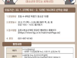 1기 참가자는 15명을 모집하는데 초등학교 4~6학년 연령 청소년이 대상이며 오는 1월 27일 9시부터 2월 12일 18시까지 김포시 청소년재단 홈페이지 통합접수시스템을 통해 프로그램 참가 신청이 가능하다.