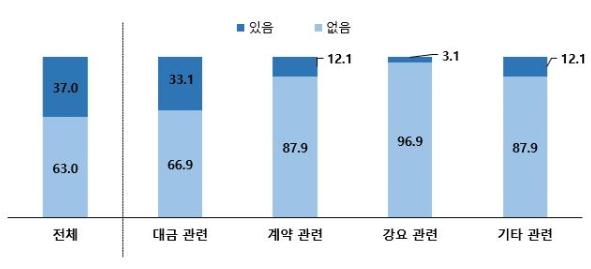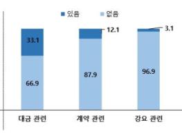 우선 전체 응답자 37%가 불공정 하도급 거래 경험이 있다고 답했는데 이를 유형별로 보면(복수 응답) ▲대금(지급 지연 등) 33.1% ▲계약(표준계약서 미작성 등) 12.1% ▲강요(기술자료 제공 등) 3.1% ▲기타 12.1%로 나타났다.
