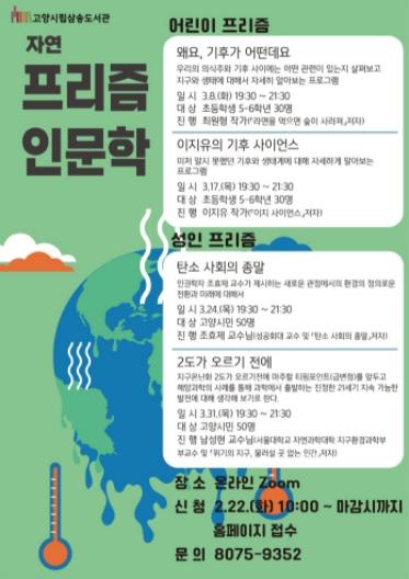 고양시 삼송도서관이 ‘지구 환경 수업’이라는 주제로 3월 8일부터 3월 31일까지 올해의 첫 ‘프리즘 인문학’을 운영한다.