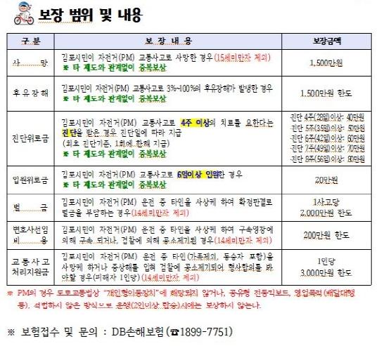 김포시는 자전거와 전동킥보드 등의 개인형 이동장치(공유형 전동킥보드 제외) 이용 시 발생할 수 있는 각종 사고에 대비하기 위해 올해도 안전보험을 가입했다.