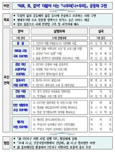이번 추진안은 ‘경기도 1인가구의 사회친화 촉진 및 지원에 관한 조례’에 따라 연도별 세우는 시행계획으로, ‘따로, 또, 같이 더불어 사는 나우리(나+우리) 공동체 구현’이라는 비전 아래 ▲총괄 ▲외로움?고립 극복 ▲혼밥개선 소셜다이닝 ▲홀로서기 지원 ▲건강지원 ▲안전 생활환경 조성 ▲웰다잉 지원 등 7개 분야 17개 과제로 구성됐다.