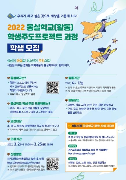 경기도교육청은 다음 달 2일부터 25일까지 도내 학생과 학교 밖 청소년을 대상으로 ‘2022년 몽실학교?활동’에 참여할 학생을 모집한다.