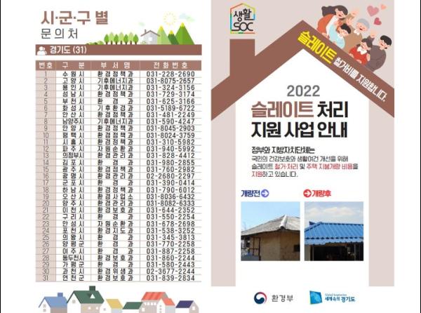 지원대상은 관내 슬레이트 주택 및 비주택(창고, 축사) 소유자이며, 기초생활수급자 등 취약계층을 우선지원 할 예정이다. 2013년부터 추진하고 있는 본 사업은 2022년에는 총 31동(주택 철거 27동, 비주택 철거 2동, 주택 지붕개량 2동)이 해당되며, 지원 금액은 주택 철거의 경우 동당 최대 352만 원, 비주택의 경우 1동당 슬레이트 면적 200㎡ 이하 지원, 주택 지붕개량의 경우 우선지원 가구는 동당 최대 439만 6천 원, 일반 가구는 동당 최대 300만 원을 지원할 계획이다.