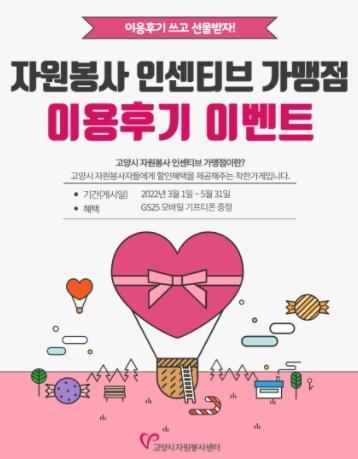 고양시자원봉사센터가 3월 1일부터 5월 31일까지“고양시 자원봉사 인센티브 가맹점 이용후기 이벤트”를 진행한다고 밝혔다.