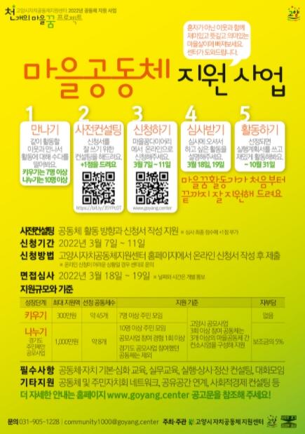 고양시 자치공동체 지원센터(센터장 권명애)가 공동체 활동 확산을 위해 2022년 마을공동체 지원 사업 공동체를 모집한다.