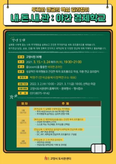 고양시 풍동도서관은 오는 3월 15일부터 3월 24일까지 총 4회(매주 화, 목 19:30~21:00)에 걸쳐 성인을 대상으로 야간 경제학교를 진행한다.