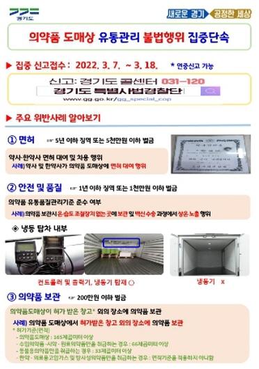 경기도 민생특별사법경찰단이 3월 7일부터 3월 18일까지 의약품 유통·판매 불법행위를 집중 수사한다.