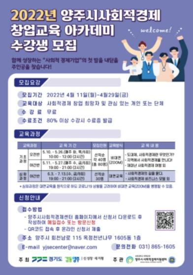 양주시사회적경제지원센터는 11일부터 오는 29일까지 2022년 사회적경제 창업교육아카데미 기초·심화과정 수강생을 선착순으로 모집한다.
